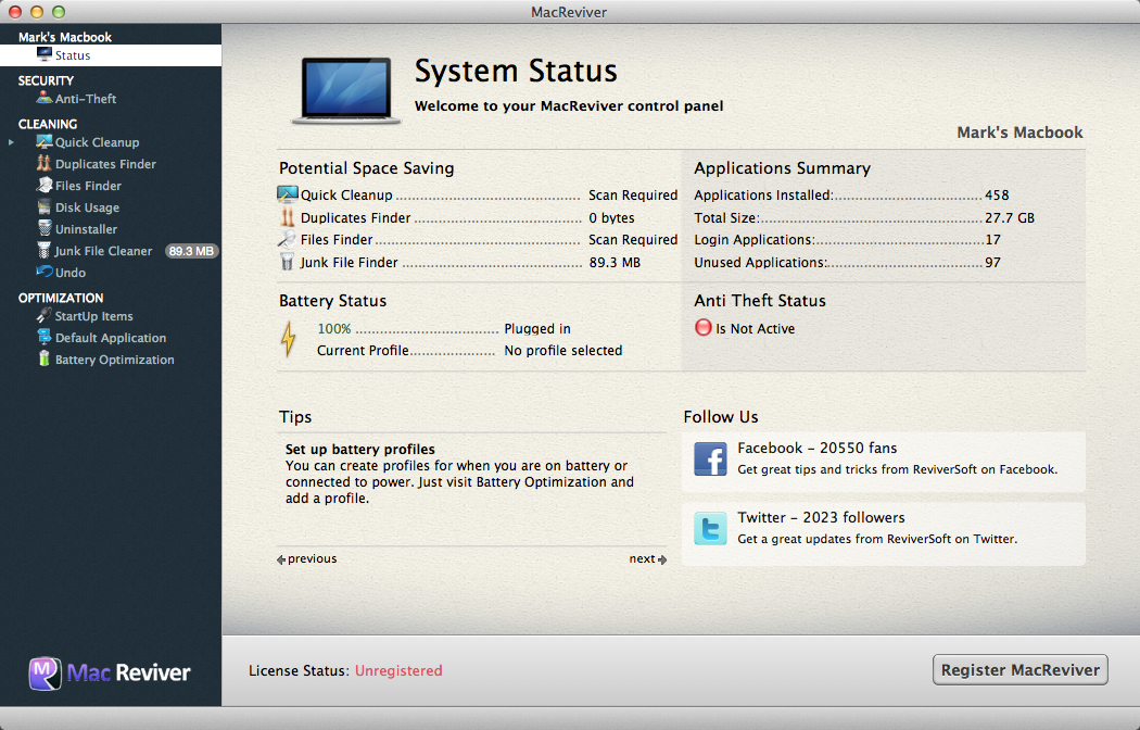 MacReviver includes all of the essential tools to help you clean, optimize and maintain your Mac and restore its performance and stability. MacReviver also includes a bonus Anti-Theft Protection feature that gives you an added layer of security against the theft of your Mac.