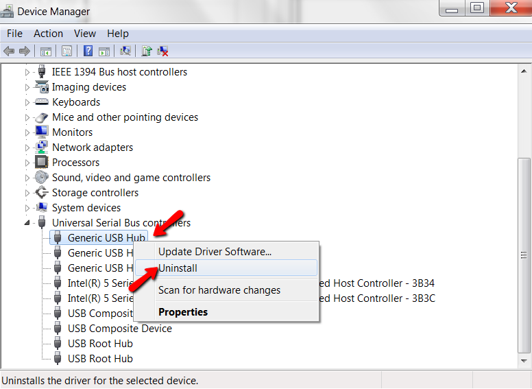 2. In the Device Manager window, open up the Universal Serial Bus controllers, right-click on each USB Hub/Device/Controller shown, choose Uninstall