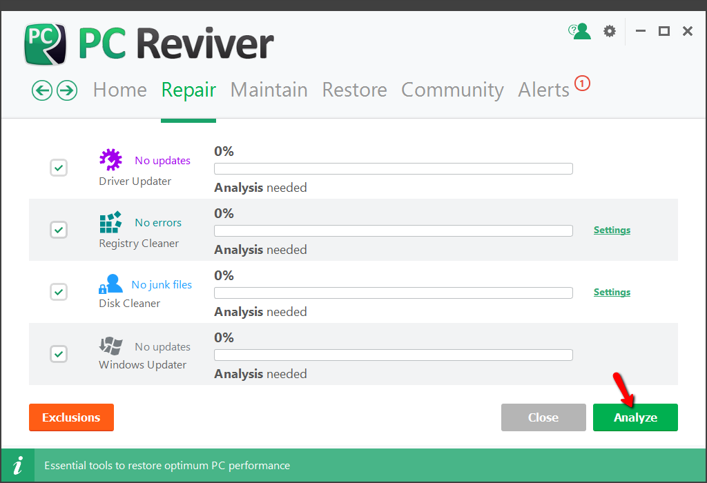 The repair section of PC Reviver scans and repairs 4 different areas of your computer: