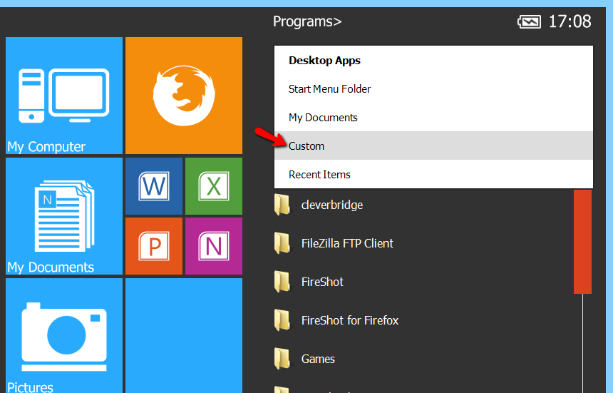 - However, if would like to personalize your extended menu a bit more, we'd recommend selecting the "Custom" option from the drop-down box and having the menu point to a custom folder with all your (preferred) files, folders and shortcuts.